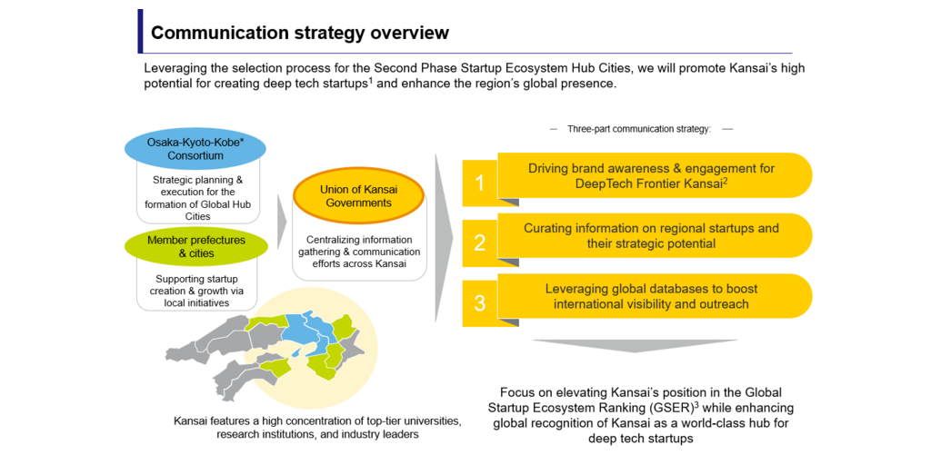 Als Reaktion auf diese Herausforderungen gab der Verband der Regierungen von Kansai auf dem Osaka Climate Innovation Forum , das am 18. September 2025 im Rahmen der Veranstaltung Global Startup Crossroads Osaka stattfand, seine strategische Ausrichtung für die internationale Kommunikation bekannt.Diese Initiative führte zur Entwicklung der Kansai Startup Ecosystem Communication Strategy (2025–2029).